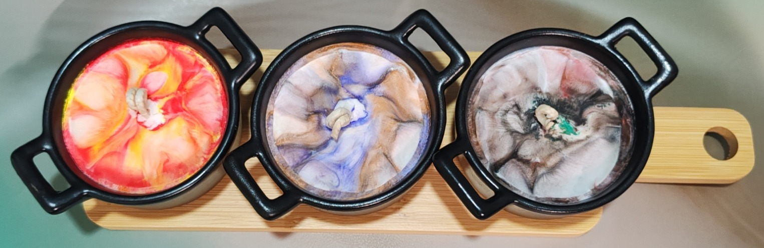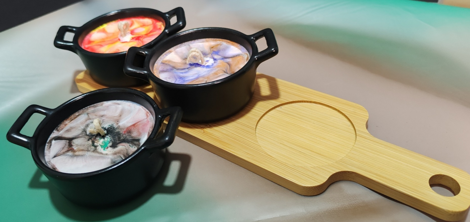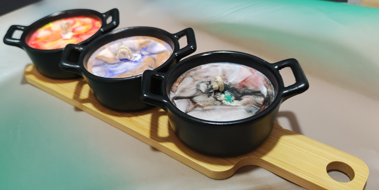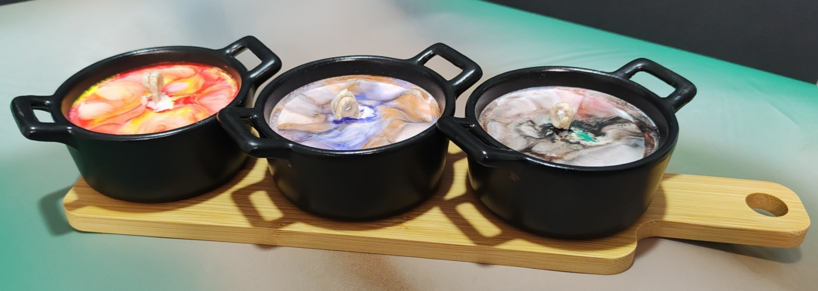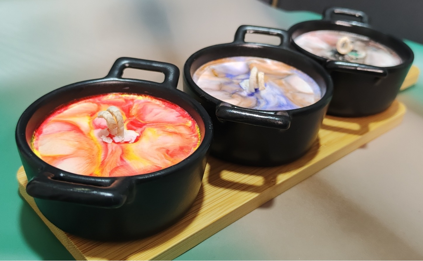 Lumanare decorativa in tigaite termice asezate pe o tava din bambus. Contine ceara de soia, cocos si coloranti naturali